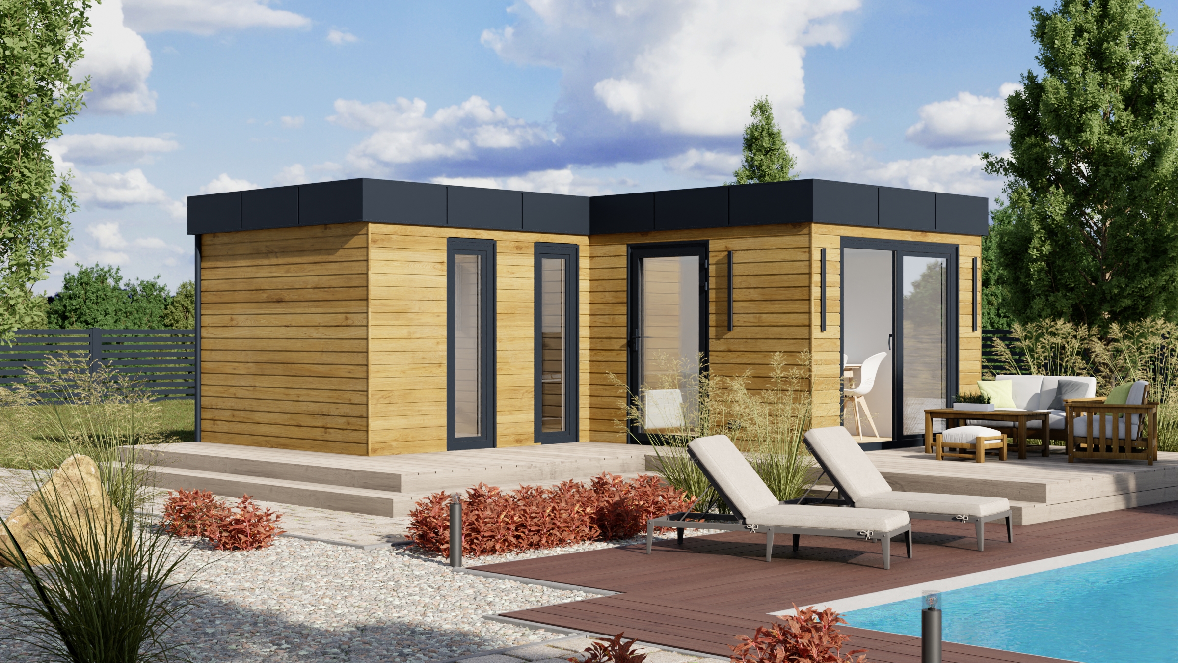 Model F ma system ukrytej instalacji elektrycznej, wentylację grawitacyjną oraz klimatyzację z funkcją grzania. Duże, czarne drzwi dwuskrzydłowe i okna aluminiowe zapewniają dużo światła i nowoczesny wygląd. Dodatkowo podest wejściowy z desek tarasowych i ściana wewnętrzna z lameli podkreślają jego prestiżowy charakter.