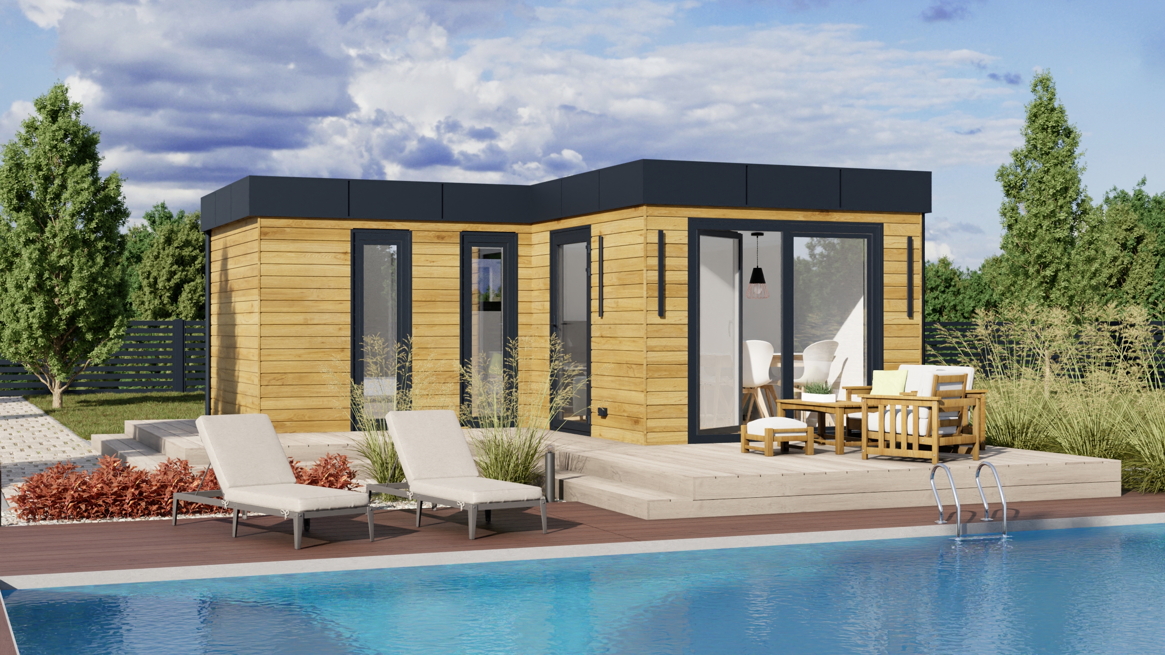 Dodatkowe opcje: Wentylacja grawitacyjna, klimatyzacja z funkcją grzania, aneks kuchenny (szafki, lodówka podblatowa, płyta indukcyjna dwupalnikowa, zlew z baterią), podest wejściowy z deski tarasowej, ściana wewnętrzna z lameli (~4,5 m²), rynna na tylnej ścianie ze spadkiem dachu