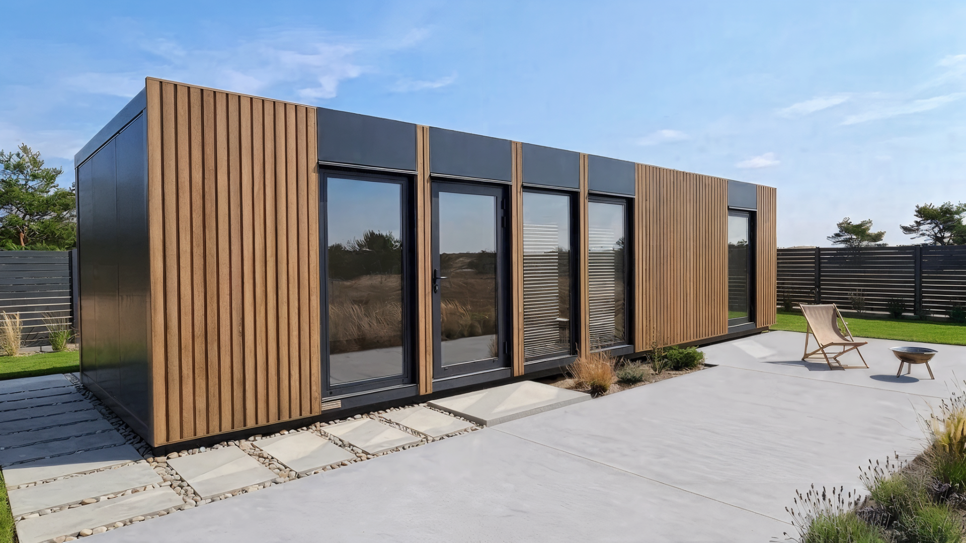 Kontener Mieszkalny Model F to całoroczny, kompaktowy dom mobilny o minimalistycznym designie, idealny na działki rekreacyjne i całoroczne.