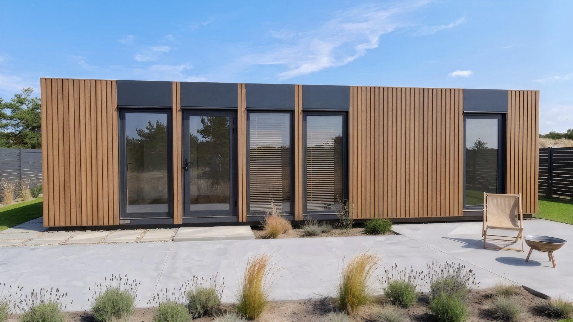 Domek Mieszkalny Model F to nowoczesny, całoroczny dom mobilny o wymiarach 6,00 × 4,00 m i powierzchni 24 m². Zbudowany na certyfikowanej stalowej ramie, posiada izolację z 10 cm płyt poliuretanowych (współczynnik 0,22 W/m²), co gwarantuje doskonałą termoizolację i akustykę. Elewacja łączy antracyt RAL 7016 z lamelami drewnopodobnymi oraz białymi kasetonami narożnymi, tworząc elegancki, minimalistyczny design.