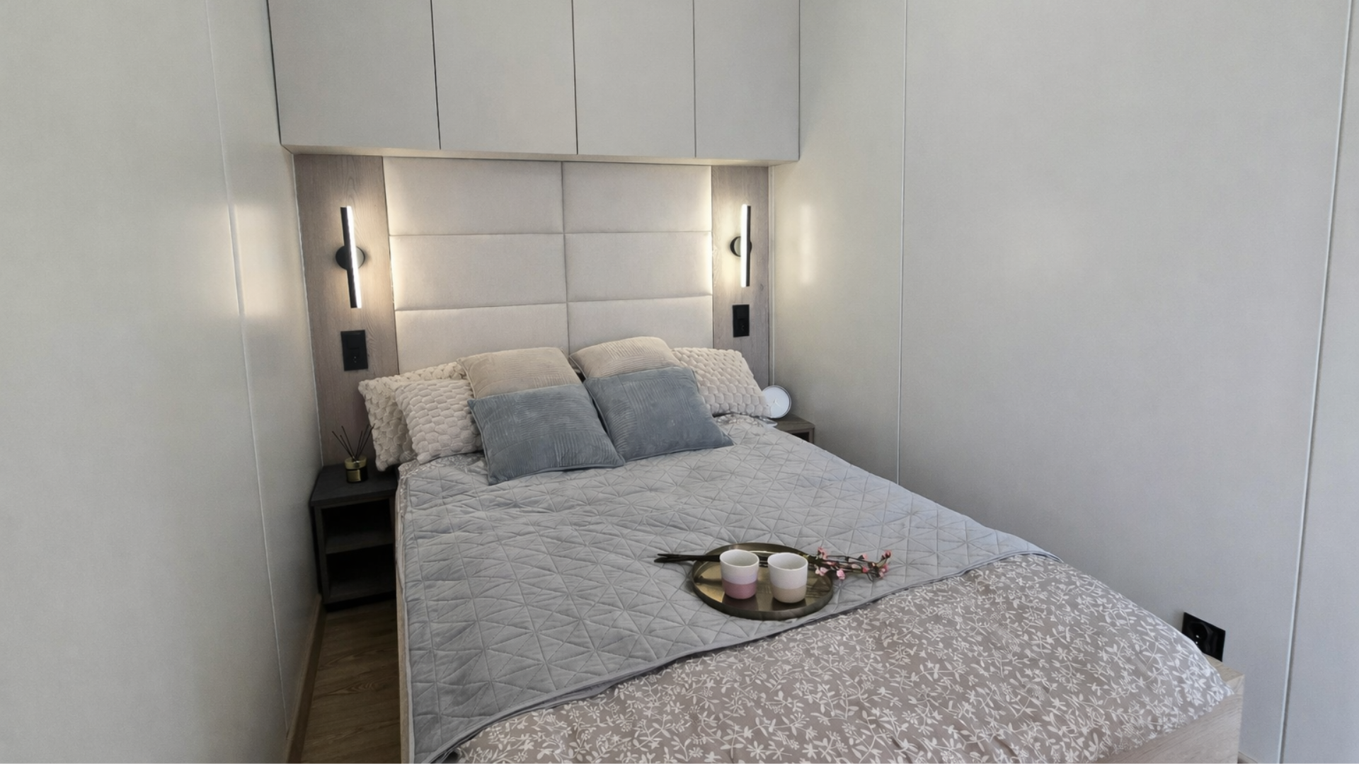 Wnętrze ma 2,50 m wysokości, wykończone wykładziną PCV imitującą jodełkę na wzmocnionej płycie OSB i drewnopodobnych listwach. Funkcjonalny układ obejmuje aneks kuchenny z lodówką podblatową, płytą indukcyjną i zlewem, a także w pełni wyposażoną łazienkę z kabiną prysznicową, WC Geberit i umywalką ze szafką.