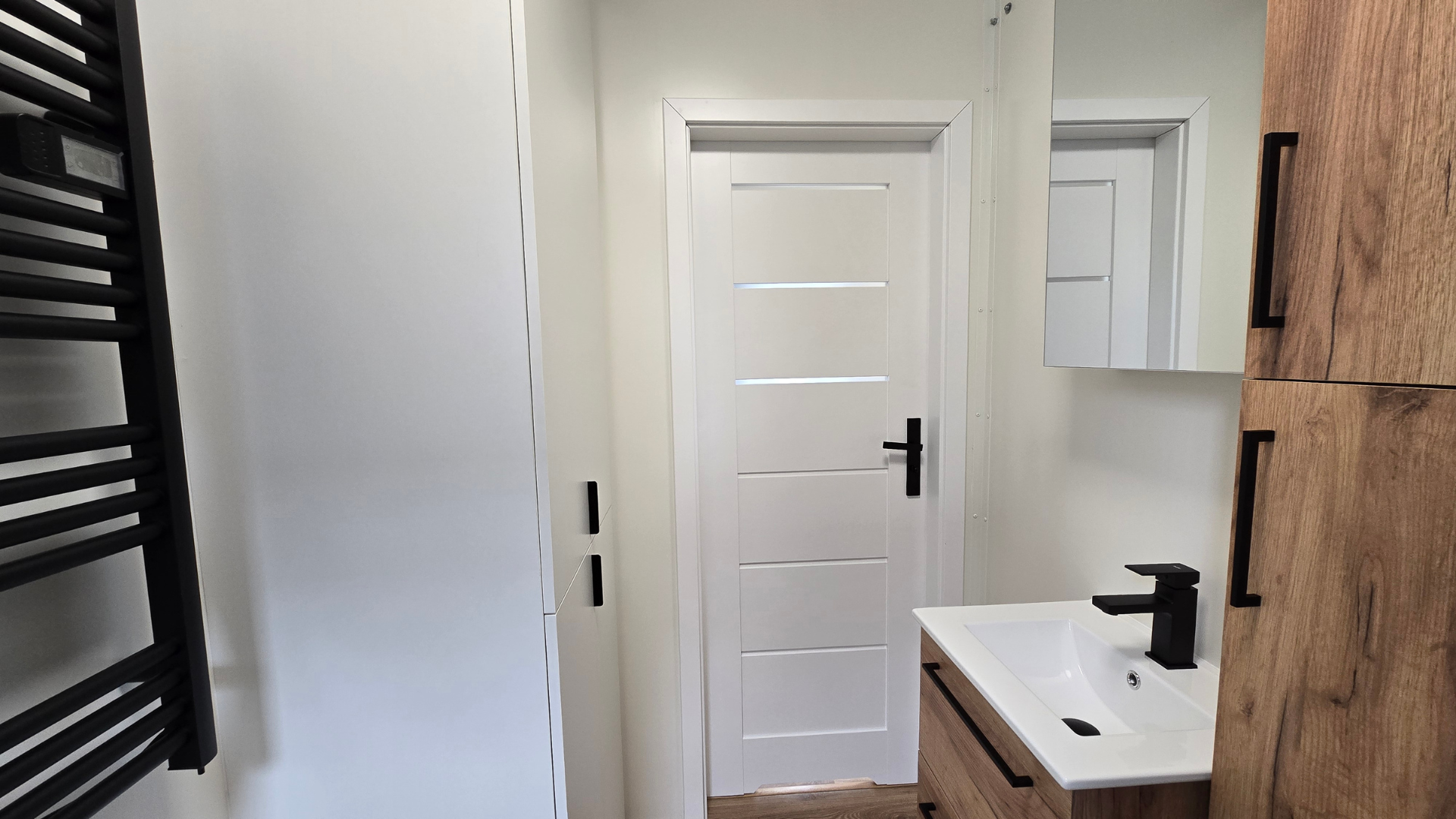 Łazienka: Drzwi MDF, WC Geberit, umywalka z wiszącą szafką, terma, kabina prysznicowa, meble (szafa i szafka nad WC), wykończenie panelami SPC