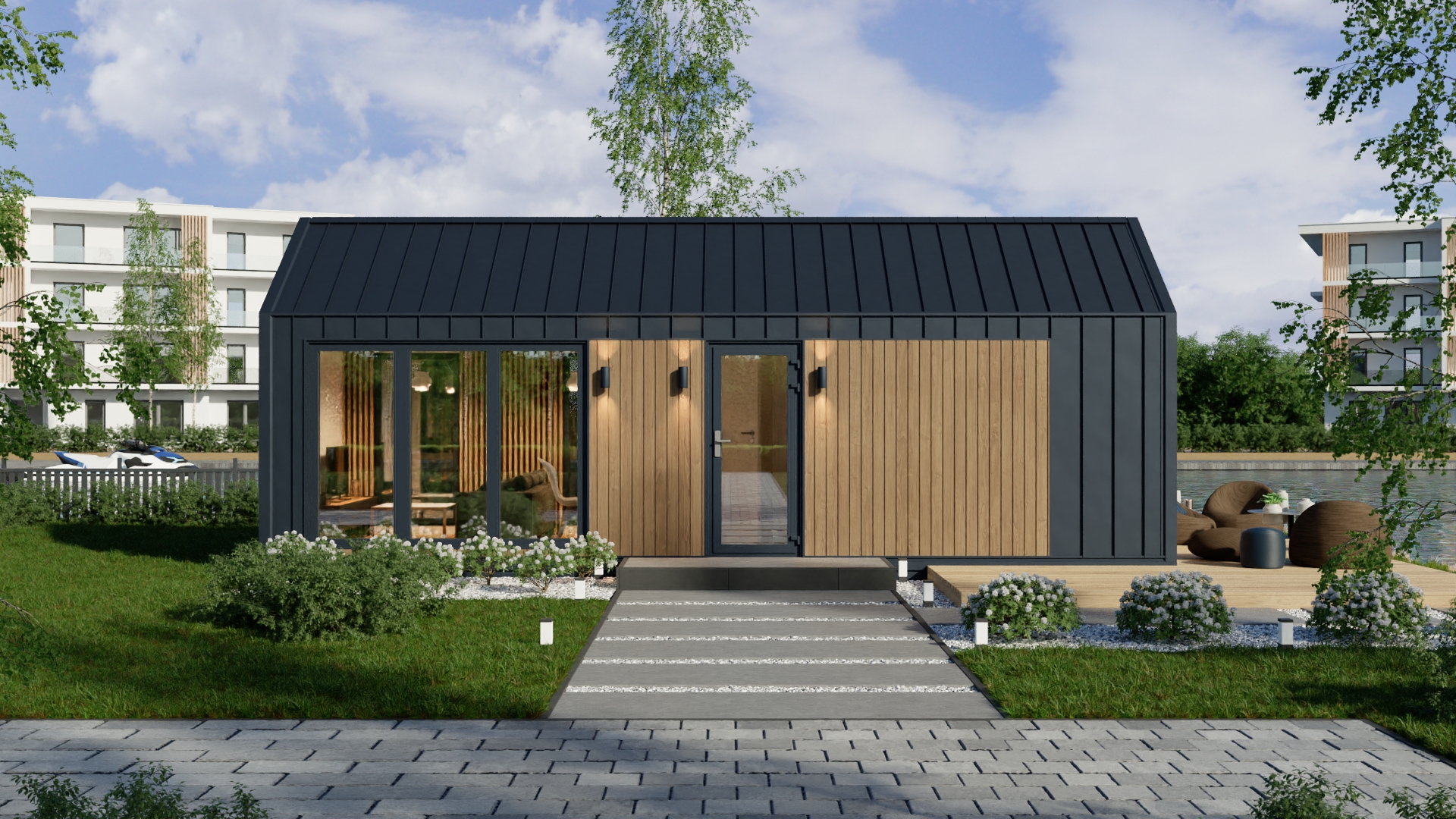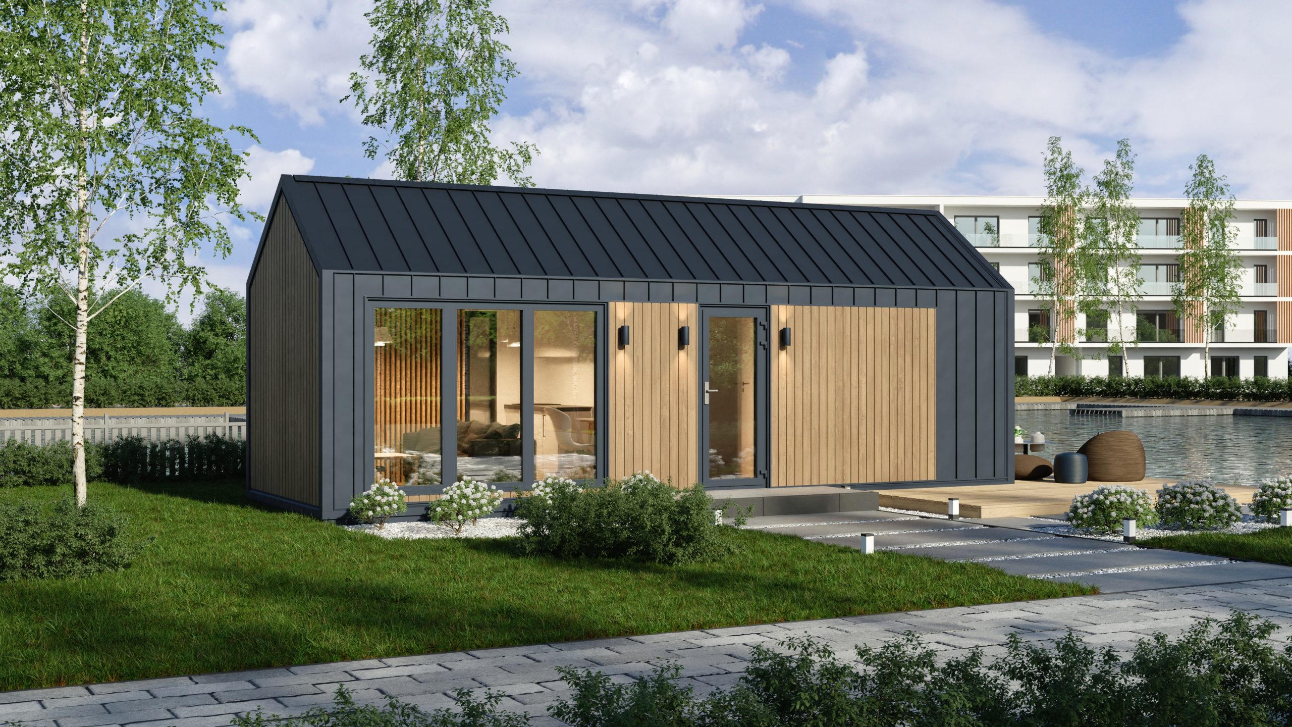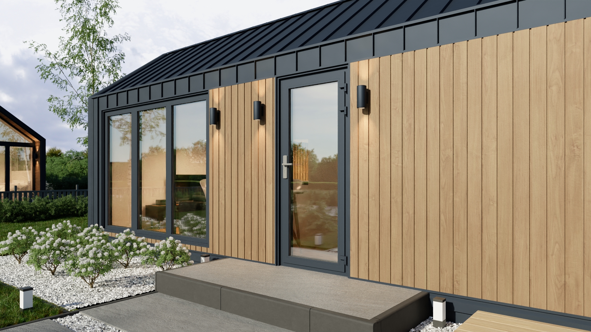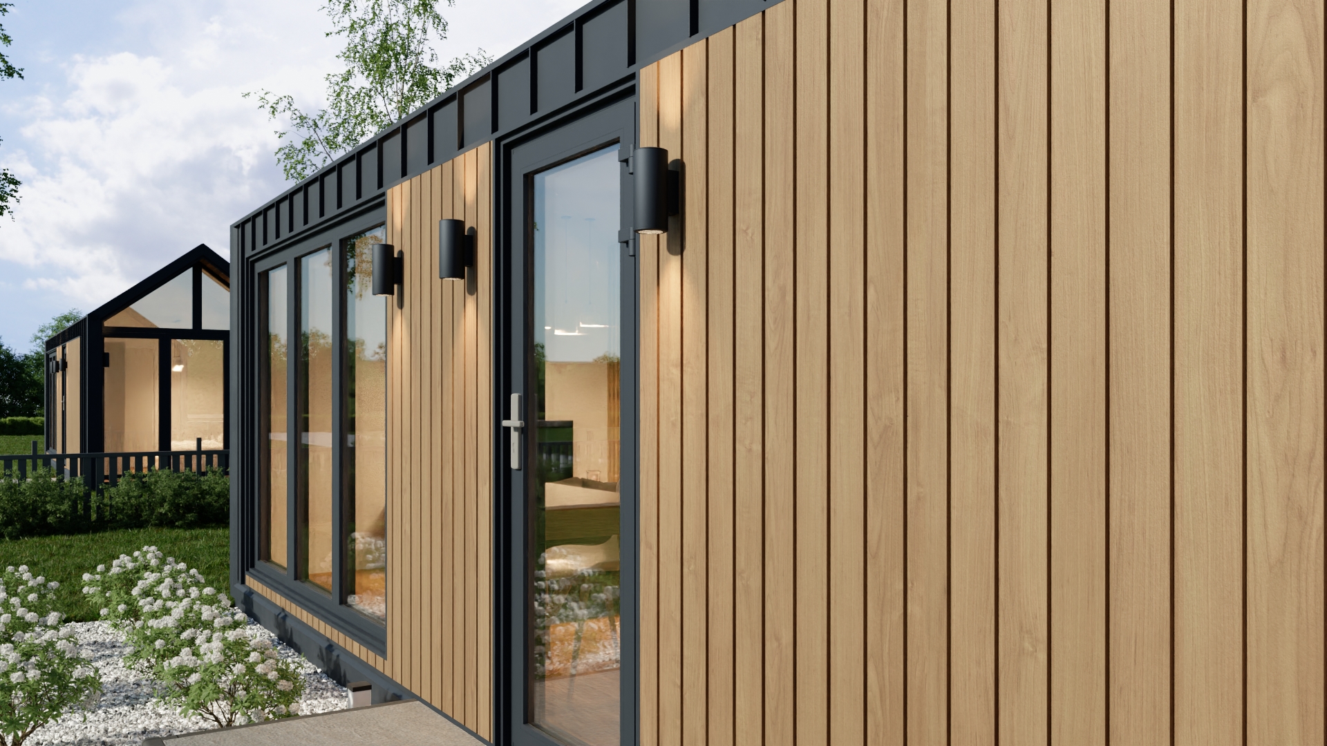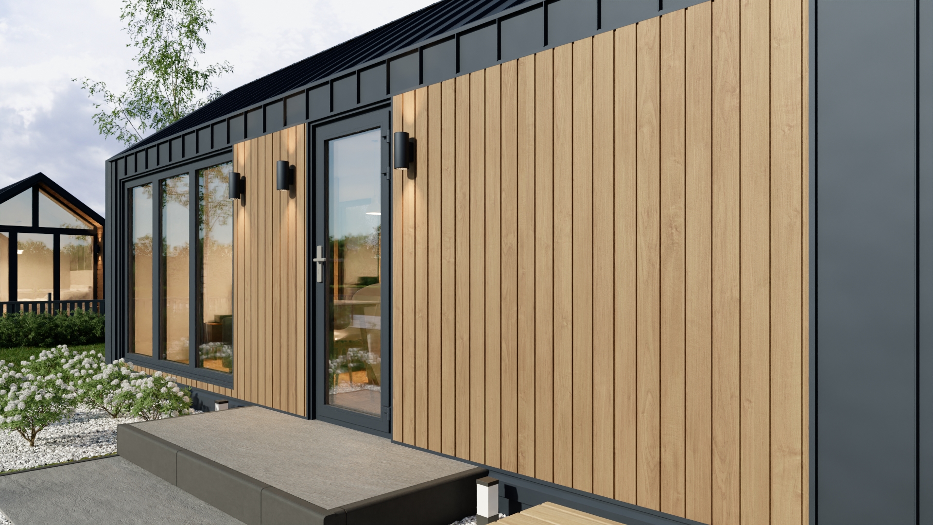 Model F ma system ukrytej instalacji elektrycznej, wentylację grawitacyjną oraz klimatyzację z funkcją grzania. Duże, czarne drzwi dwuskrzydłowe i okna aluminiowe zapewniają dużo światła i nowoczesny wygląd. Dodatkowo podest wejściowy z desek tarasowych i ściana wewnętrzna z lameli podkreślają jego prestiżowy charakter.