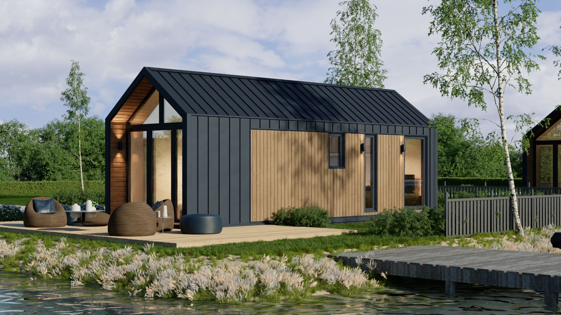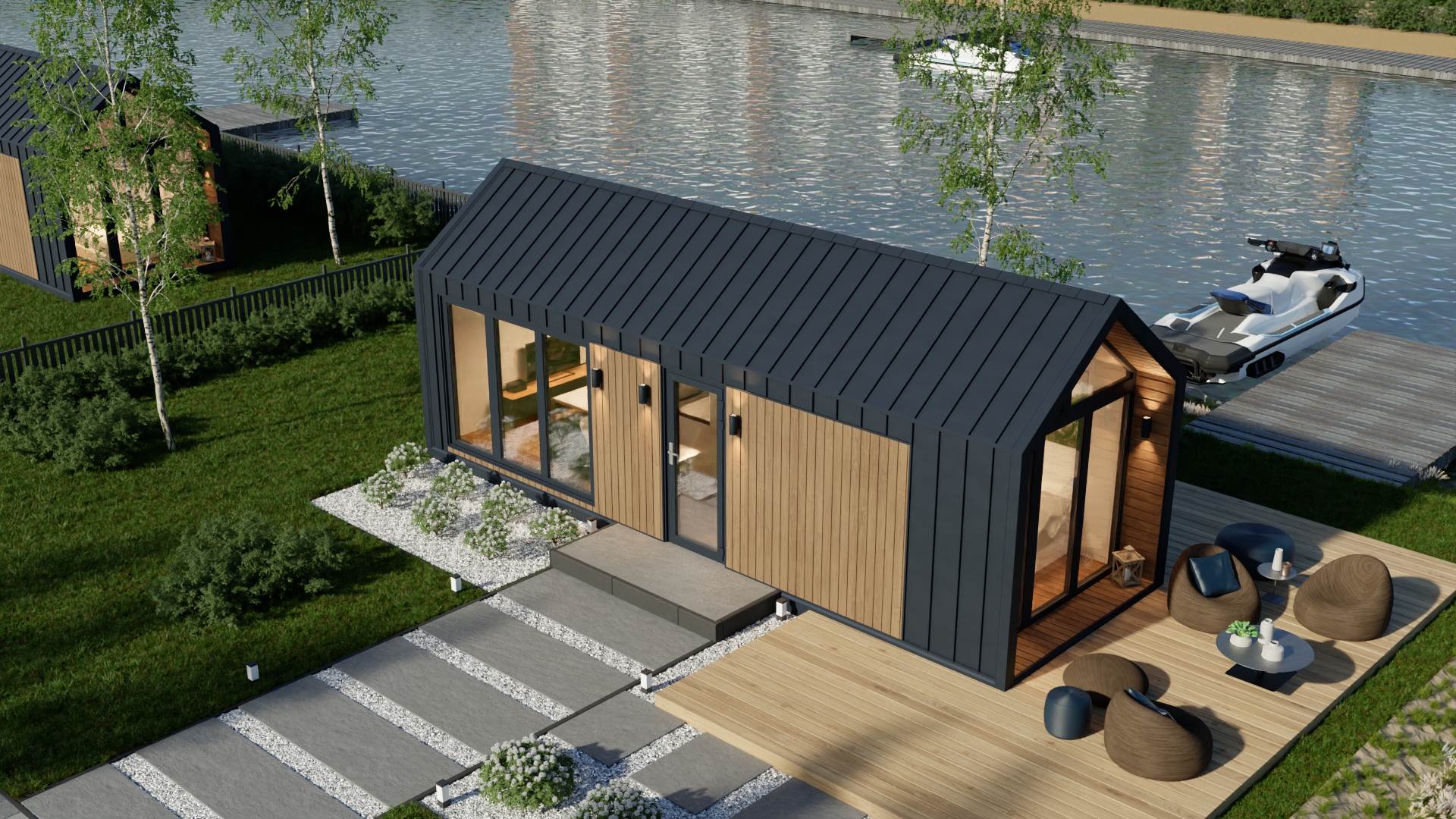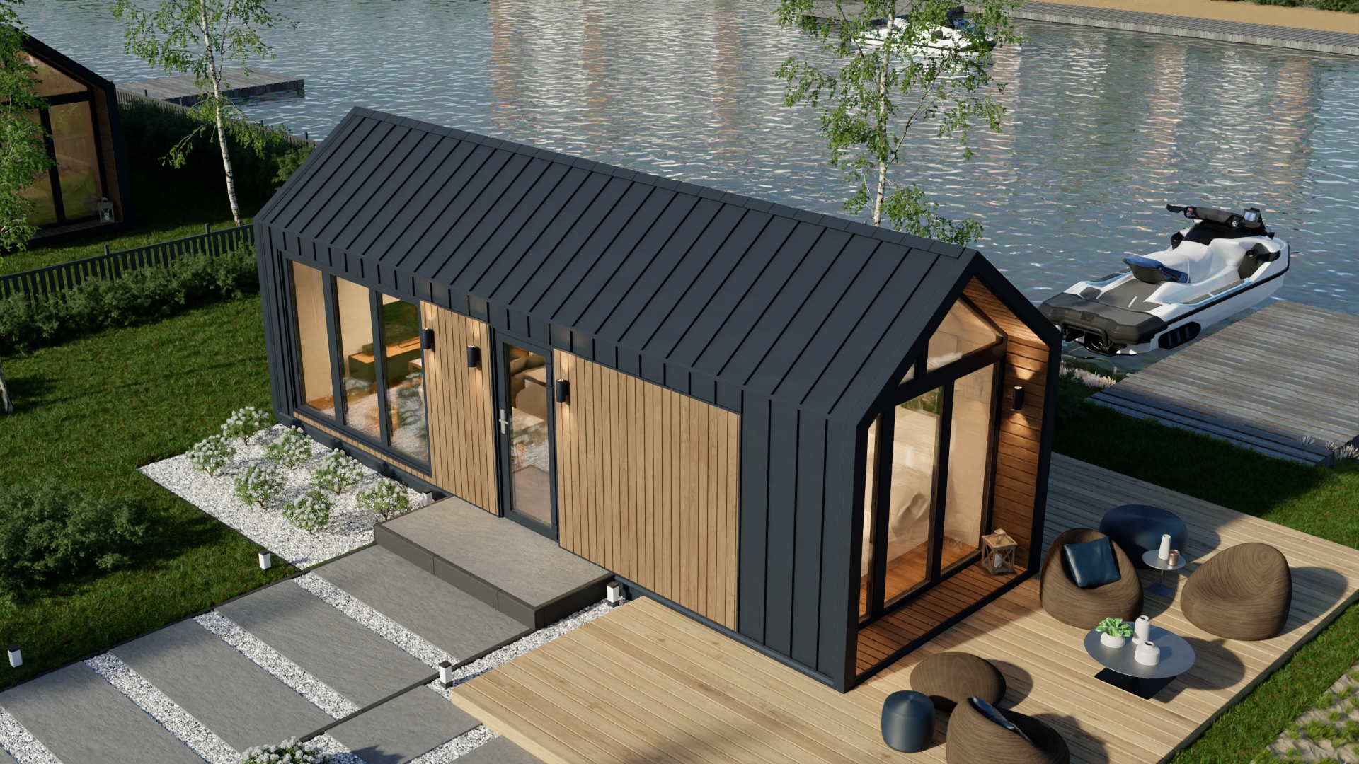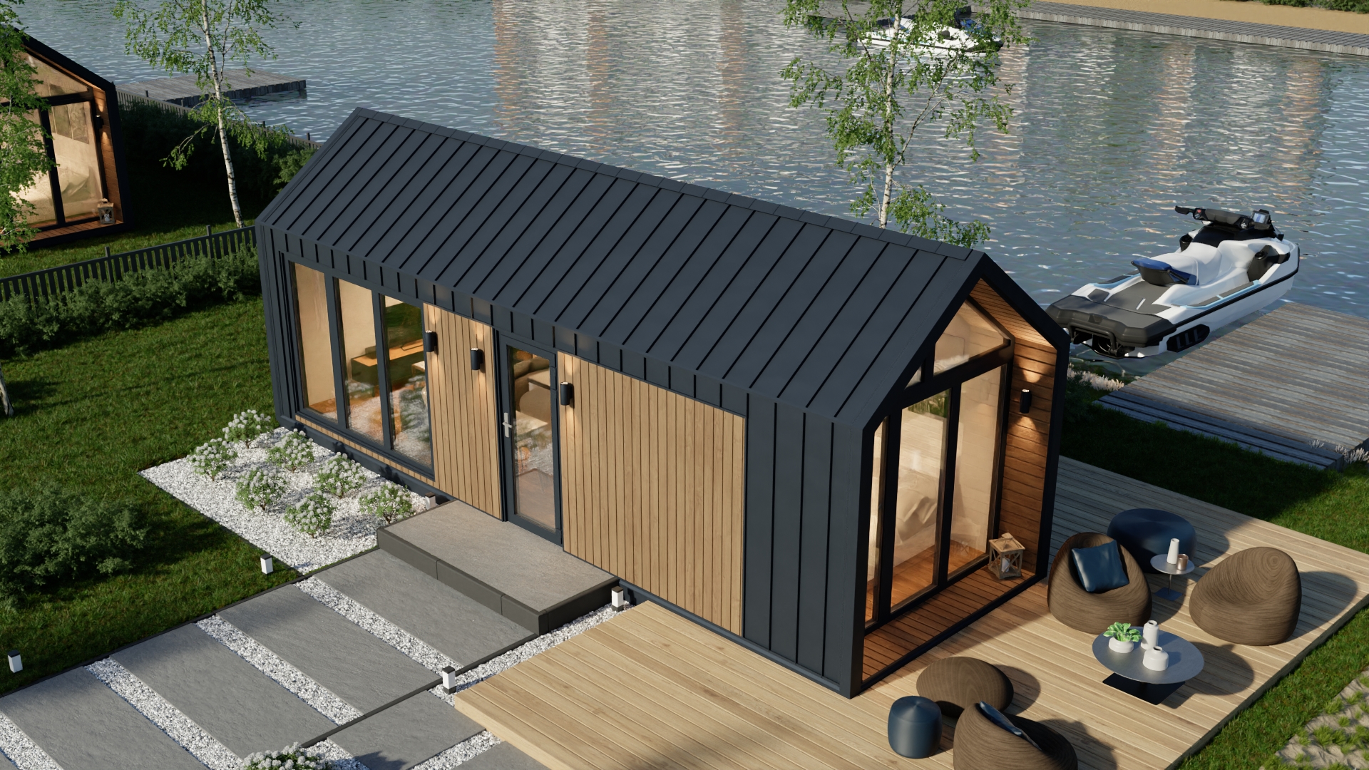 Model F ma system ukrytej instalacji elektrycznej, wentylację grawitacyjną oraz klimatyzację z funkcją grzania. Duże, czarne drzwi dwuskrzydłowe i okna aluminiowe zapewniają dużo światła i nowoczesny wygląd. Dodatkowo podest wejściowy z desek tarasowych i ściana wewnętrzna z lameli podkreślają jego prestiżowy charakter.