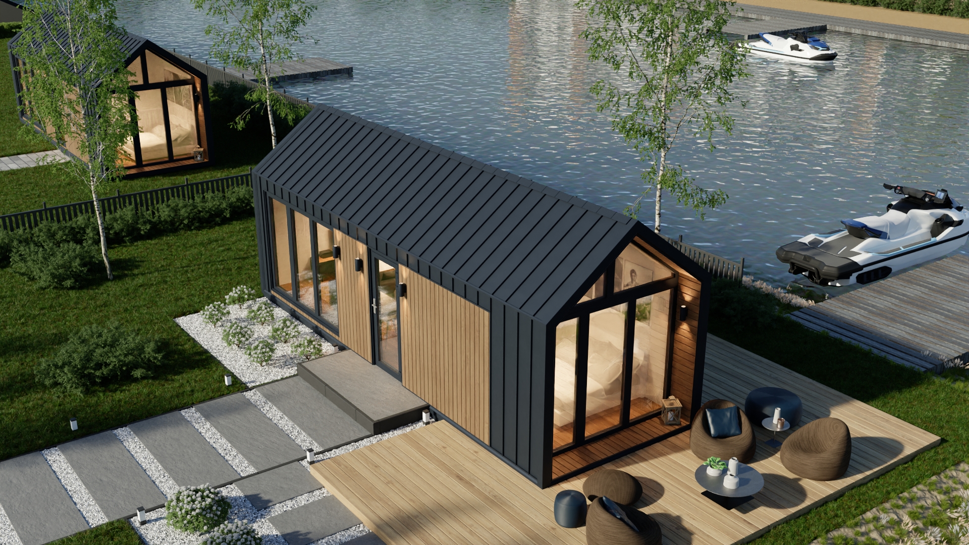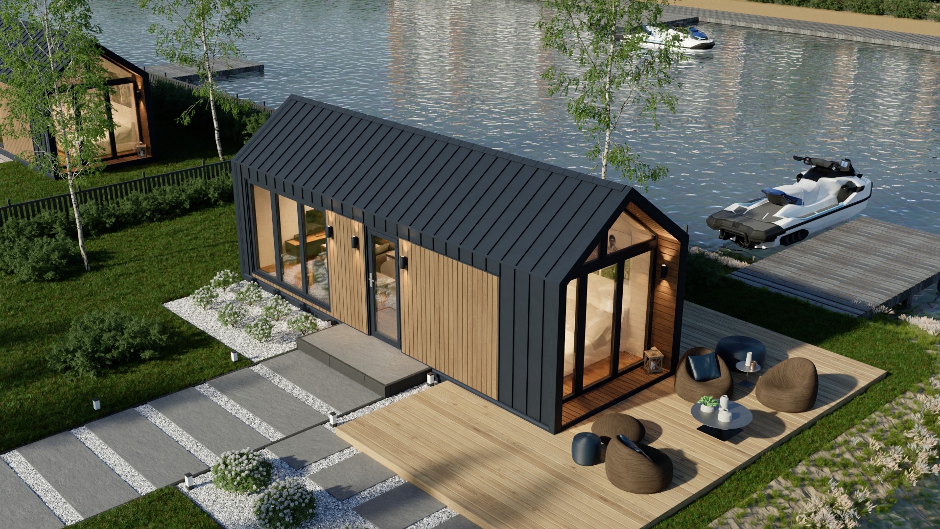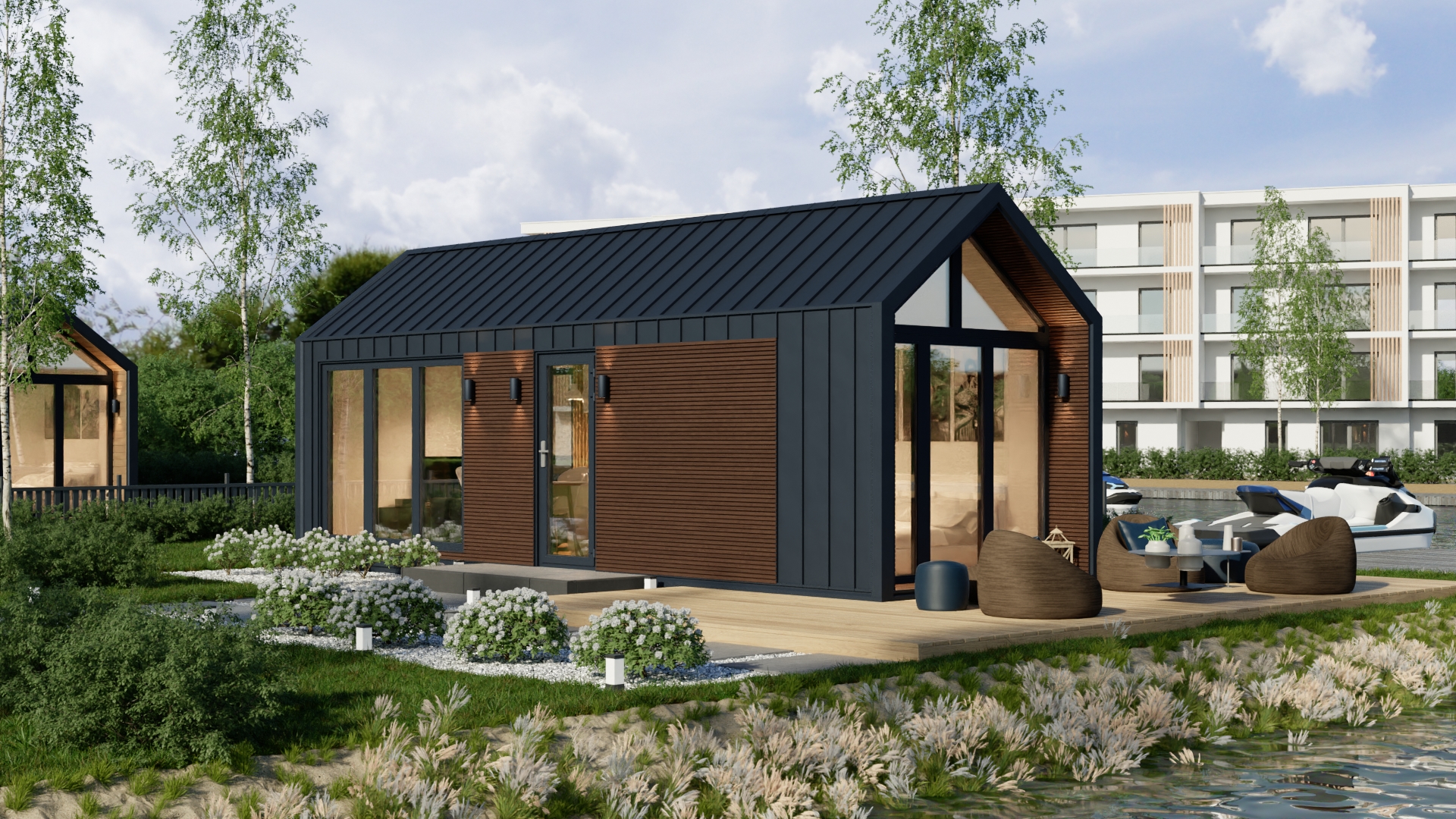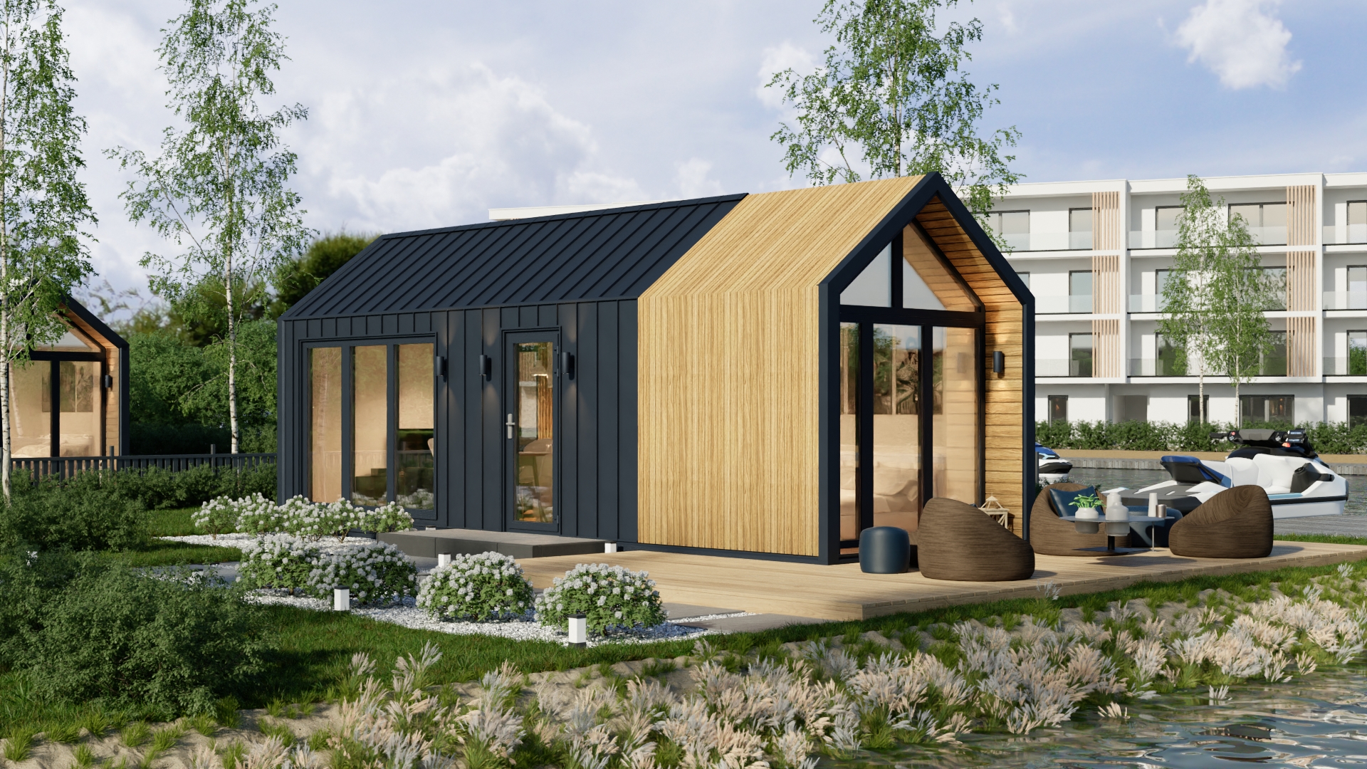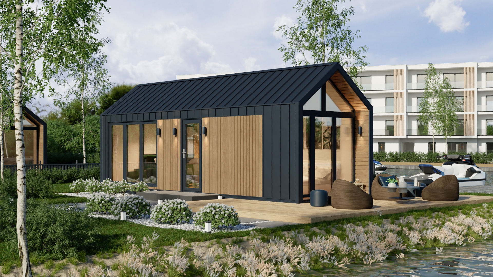 Model F ma system ukrytej instalacji elektrycznej, wentylację grawitacyjną oraz klimatyzację z funkcją grzania. Duże, czarne drzwi dwuskrzydłowe i okna aluminiowe zapewniają dużo światła i nowoczesny wygląd. Dodatkowo podest wejściowy z desek tarasowych i ściana wewnętrzna z lameli podkreślają jego prestiżowy charakter.